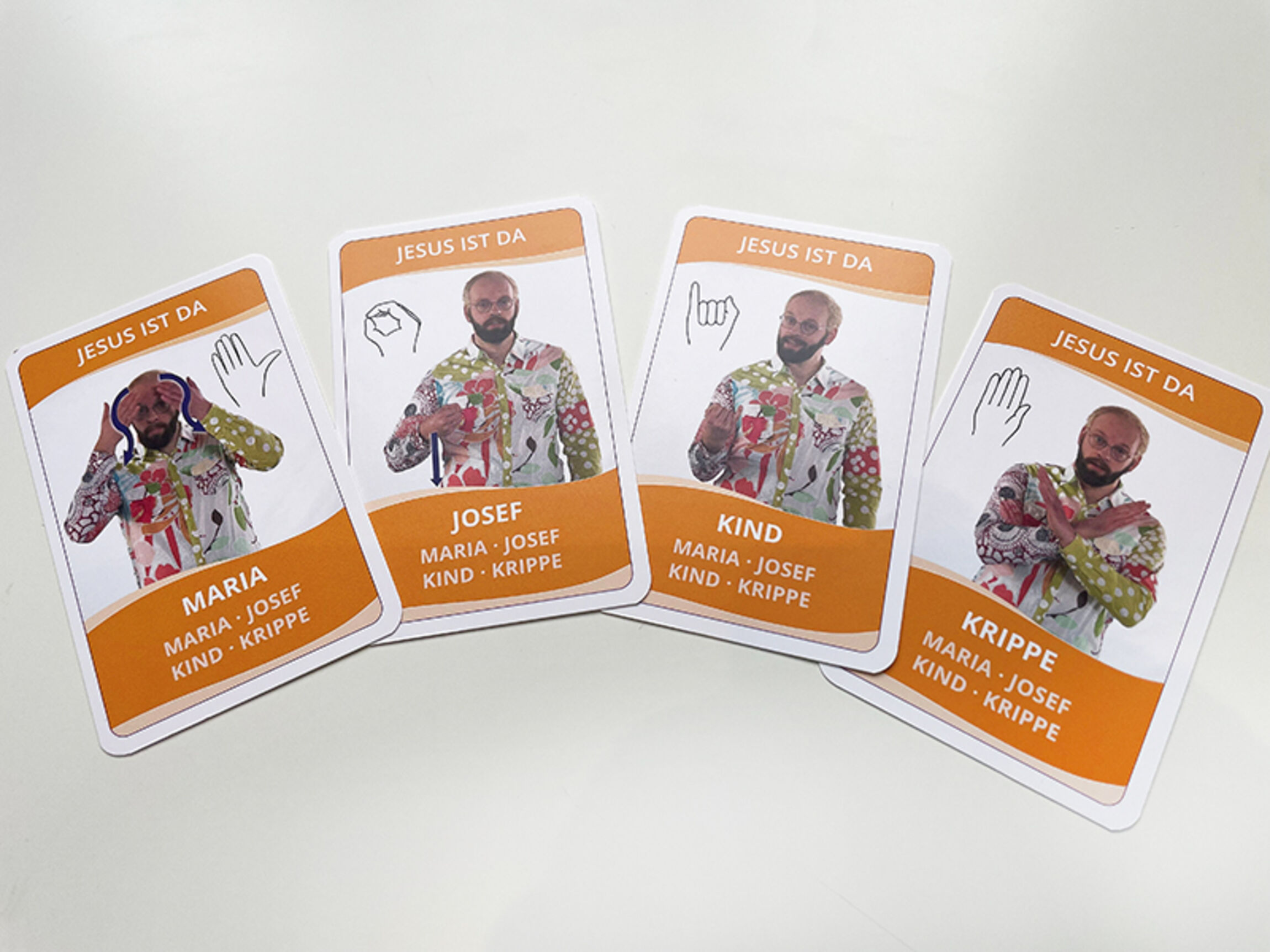 Da gibt es Maria, deren langes Haar mit den Händen nachgezogen wird, Josef, der durch seinen Stock dargestellt wird, das Kind, das mit dem kleinen Finger symbolisiert wird und schließlich die Krippe mit ihrer gekreuzten Form.