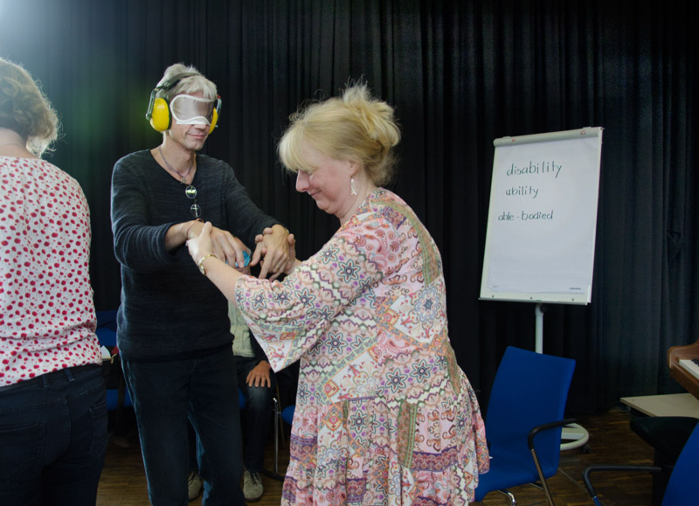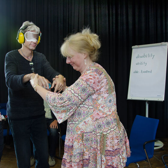 In fünf Workshops und einem abschließenden Dunkelgottesdienst können die Teilnehmenden das Fachtages schließlich selbst Erfahrungen machen, die über die rein kognitive Wahrnehmung hinaus gehen: Woran erkenne ich mein Gegenüber, wenn ich weder sehen noch hören kann? Wie kann ich mit ihm in Kontakt kommen? Welche Bilder entstehen im Kopf, wenn ich das Vaterunser gebärde? Werden das Herz und die Gefühle alter Menschen auch dement? Und was wäre ich in dieser stockdunklen Kapelle, gäbe es nicht Menschen, die sich hier zurechtfinden und mich zu meinem Platz führen würden?