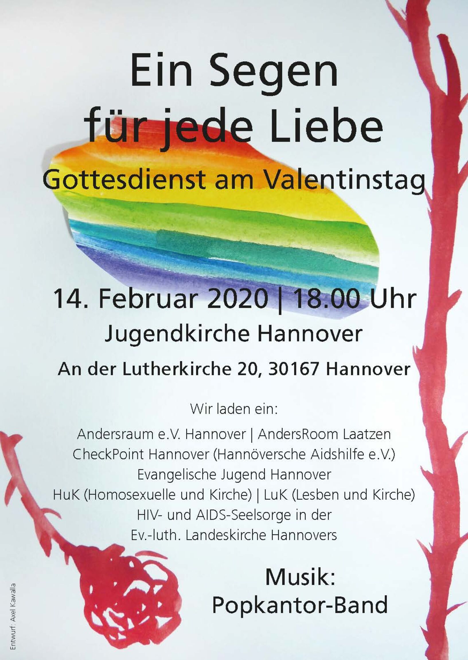 „Ein Segen für jede Liebe“ – unter dieser Überschrift laden die HIV- und AIDS-Seelsorge der Evangelisch-lutherischen Landeskirche Hannovers und die Evangelische Jugend Hannover gemeinsam mit weiteren Partnern zu einem Gottesdienst am Valentinstag ein. „Egal ob Single oder verheiratet, ob lesbisch, schwul oder hetero – alle sind willkommen und wer will, wird gesegnet und bekommt eine Rose geschenkt“, sagt Pastor Axel Kawalla, Beauftragter für die HIV- und AIDS-Seelsorge in der Landeskirche Hannovers. Der Gottesdienst beginnt am Freitag, 14. Februar, um 18 Uhr in der Jugendkirche Hannover, An der Lutherkirche 20. Für Musik sorgt die Popkantor-Band.