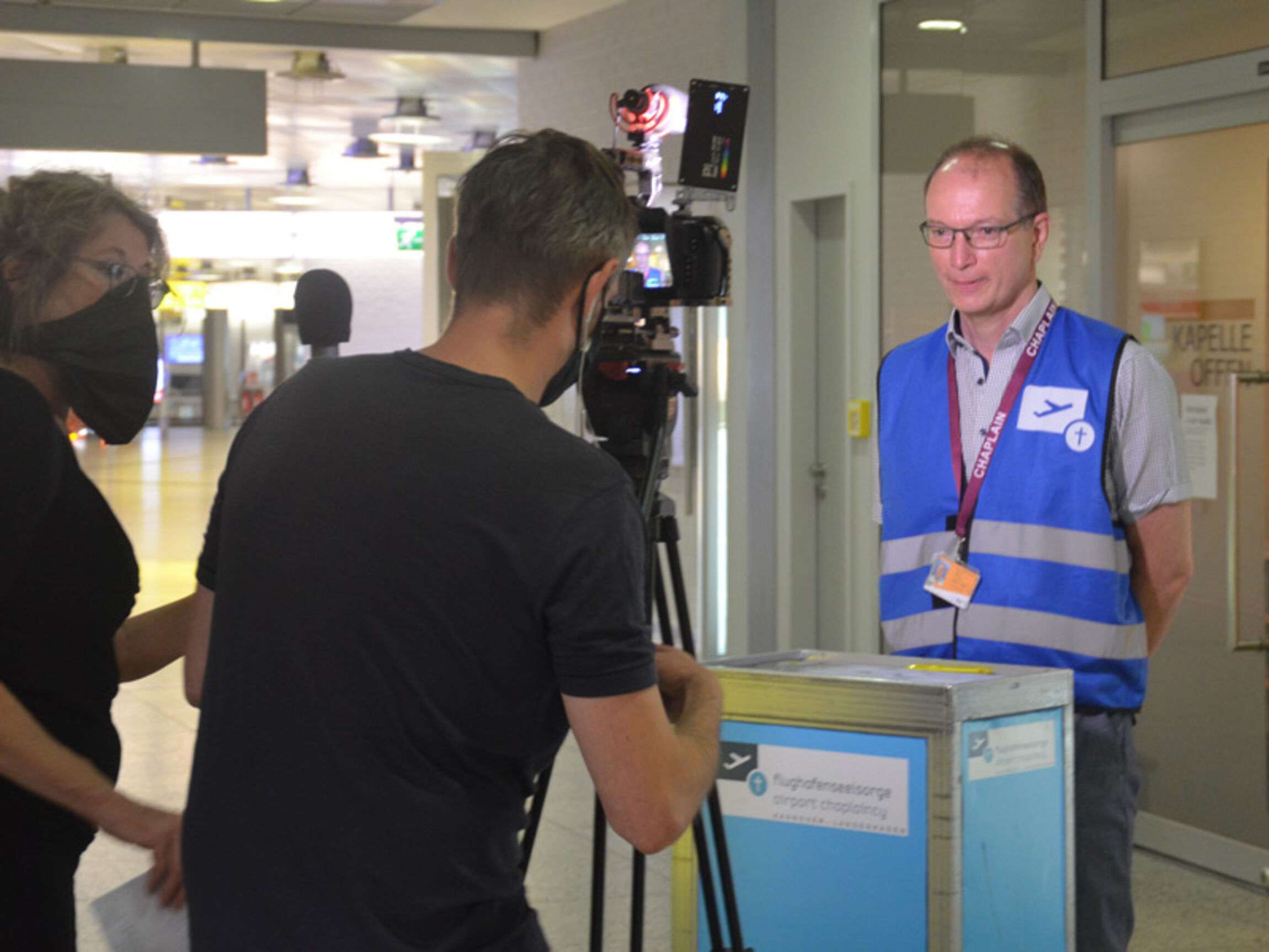 Entmutigen lässt sich Harms von dieser Barriere nicht: Regelmäßig sind er und sein ehrenamtliches ökumenisches Team mit dem Trolley und kleinen Mitgebseln in den Terminals unterwegs. Harms trägt auch beim Mittagessen in der Kantine die Weste, die ihn als Seelsorger erkennbar macht, und setzt sich häufig mit Klappstuhl und Glocke vor die Tür der Flughafenkapelle: „Gleich gegenüber kommen regelmäßig Mitarbeitende des Flughafens aus der Zugangsschleuse und wir kommen hier gut ins Gespräch.“ Bislang, so berichtet Harms weiter, seien Flughafenbeschäftigte noch nicht von sich aus mit ihren wirtschaftlichen Sorgen an ihn herangetreten; dies sei aber auch ganz in Ordnung: „Ich selbst bin ja angefragt, auf die Menschen zuzugehen.“ Die Reaktionen fielen ganz überwiegend positiv aus: „Die meisten freuen sich, wenn ich sie anspreche, und viele sind auch überrascht, Kirche und Seelsorge an diesem Ort, weitab von jedem Kirchturm, anzutreffen.“