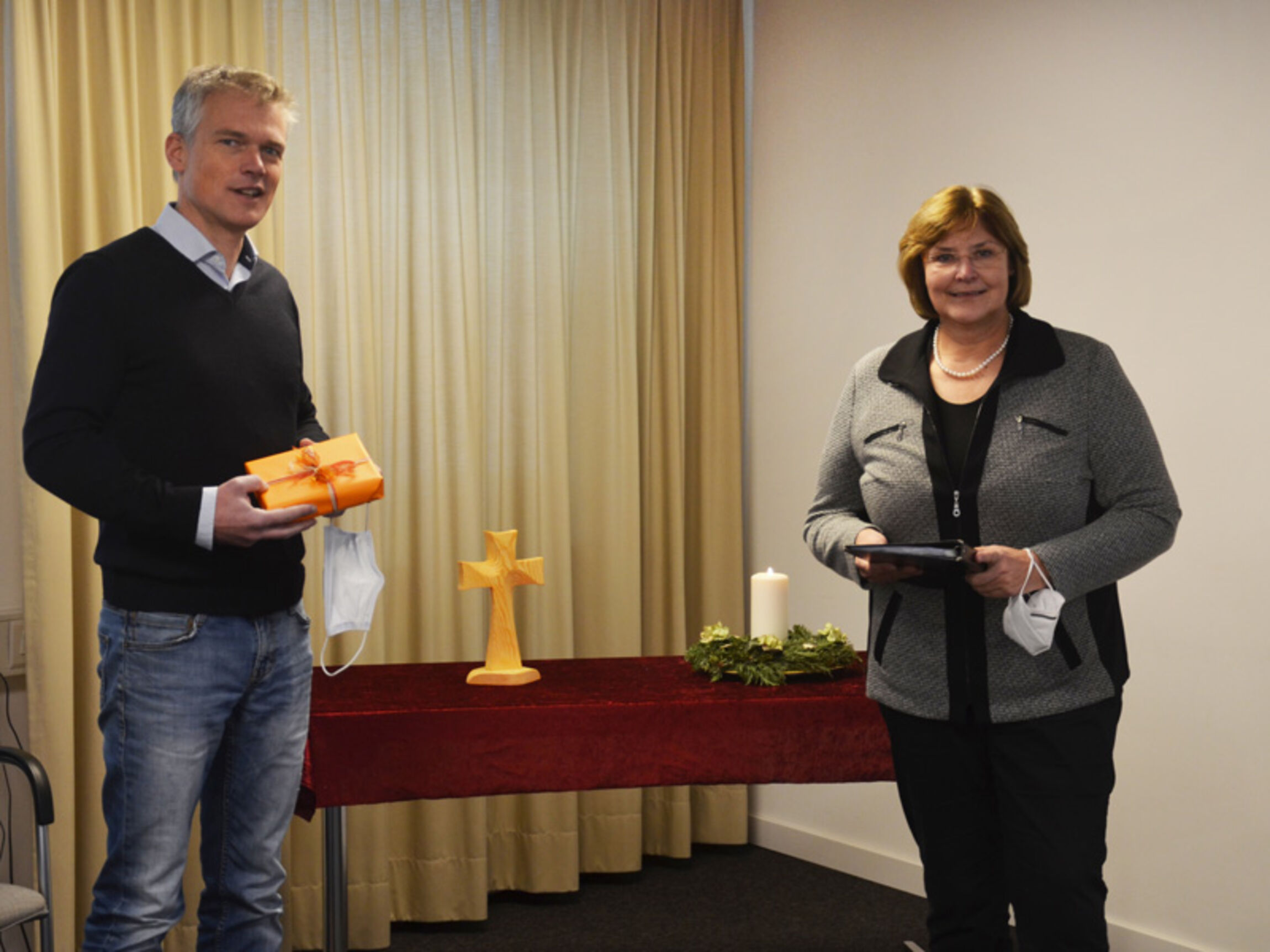 „Wir alle hier im Haus können ein bisschen stolz darauf sein, dass du diese neue, wichtige Aufgabe übernimmst“, verabschiedete Angela Grimm Wißmann aus dem Zentrum für Seelsorge und Beratung. Unter strengen Hygieneauflagen hatten sich zur Verabschiedung und Entpflichtung nur wenige Mitarbeitende im ZfSB versammelt; viele weitere nahmen per Videokonferenz von zu Hause aus an der kurzen Zeremonie teil.
