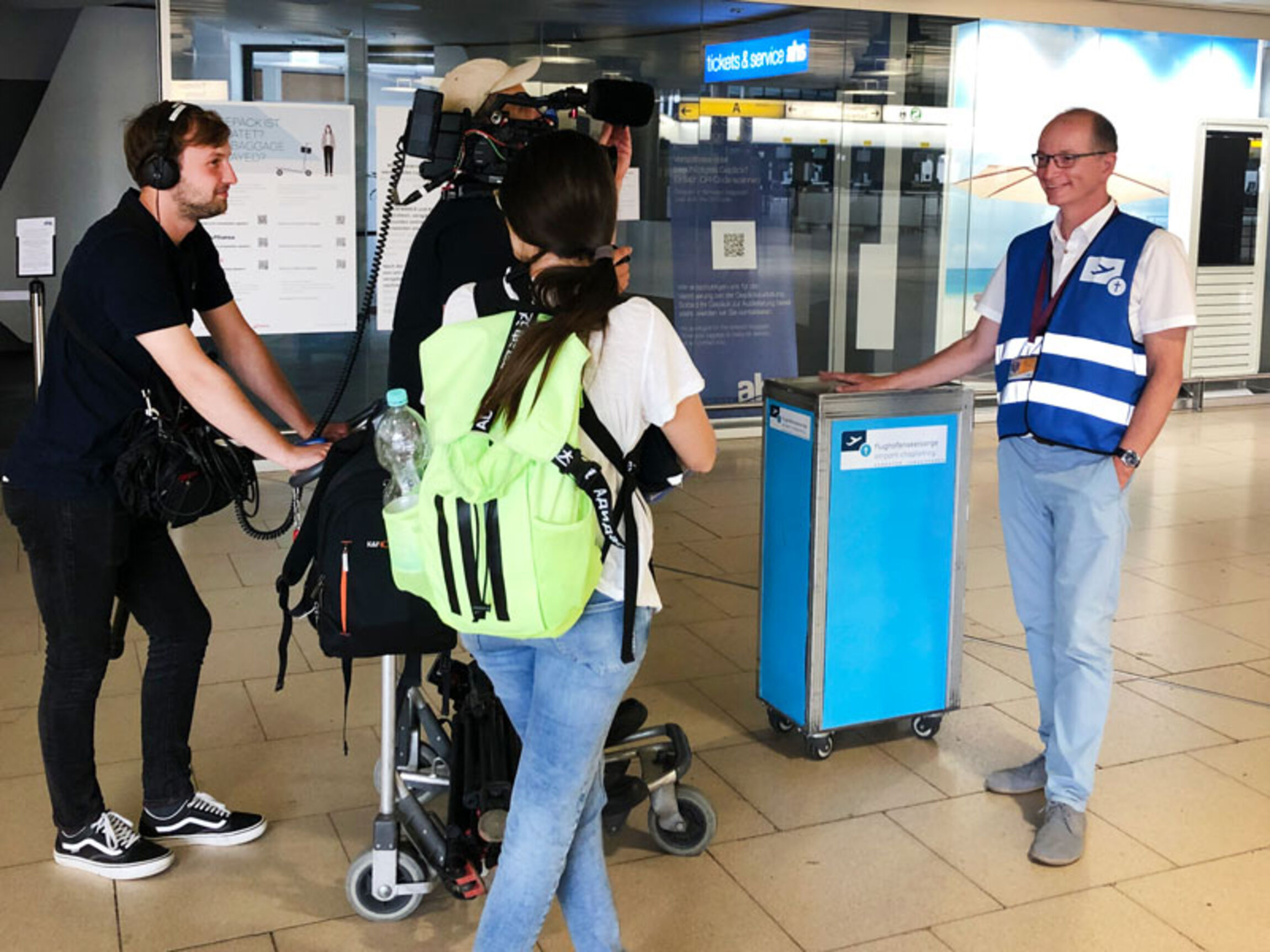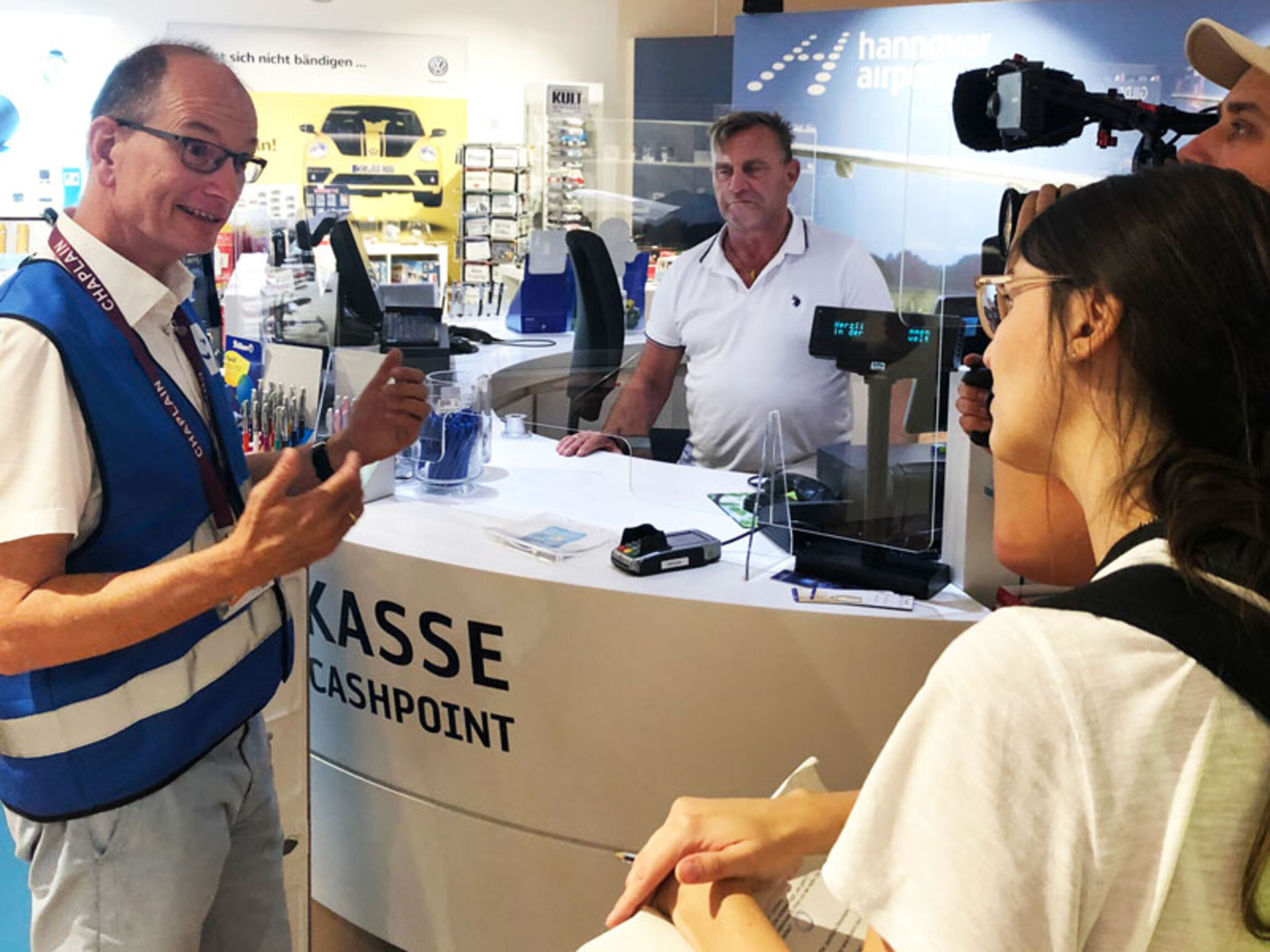 „Das Storyboard von Sophie Scholz trug dazu bei, den Tag strukturiert zu gestalten“, erzählt Harms. Ziel des Drehs war es, seine Arbeit als Flughafenseelsorger anschaulich ins Bild zu bringen – natürlich auch vor dem Hintergrund der vielen negativen Schlagzeilen, die deutsche Flughäfen aktuell liefern. Der Flughafenseelsorger wurde an verschiedenen Drehorten von Sophie – schnell waren alle beim „du“ gelandet – interviewt: in seinem Büro, in den Abflugterminals, beim Boarding, im Betriebsrestaurant Skylight und in der Flughafen-Kapelle. „Der Film wird zeigen, dass ein Flughafenseelsorger im Laufe eines Tages viel unterwegs ist“, erzählt Harms. „Möglichkeiten zum Gespräch bieten sich sozusagen im Vorbeigehen: mit Beschäftigten und mit Reisenden.“ So sprach er während des Drehs mit einer Gruppe junger Männer aus Bremen, die auf ihren Flug nach Mallorca wartete. „Einer der Männer hatte Flugangst. Ich fragte ihn nach seinen Ressourcen im Umgang mit Stress und die Gruppe zeigte sich sehr offen für unser niedrigschwelliges Gesprächsangebot – obwohl die jungen Männer vorher noch nie von der Flughafenseelsorge gehört hatten.“ Harms traf auch eine Gruppe junger Frauen, die einen Junggesellinnenabschied mit einem Überraschungsflug nach Sardinien zelebrierten; im Duty-Free-Shop führte er ein längeres Gespräch mit einer Mitarbeiterin, die er als Frau eines Bestatters aus der Wedemark kennengelernt hatte. Aus Datenschutzgründen konnten die sonst üblichen Gespräche mit Beamt*innen der Bundespolizei und des Sicherheitsdienstes nicht gefilmt werden.
