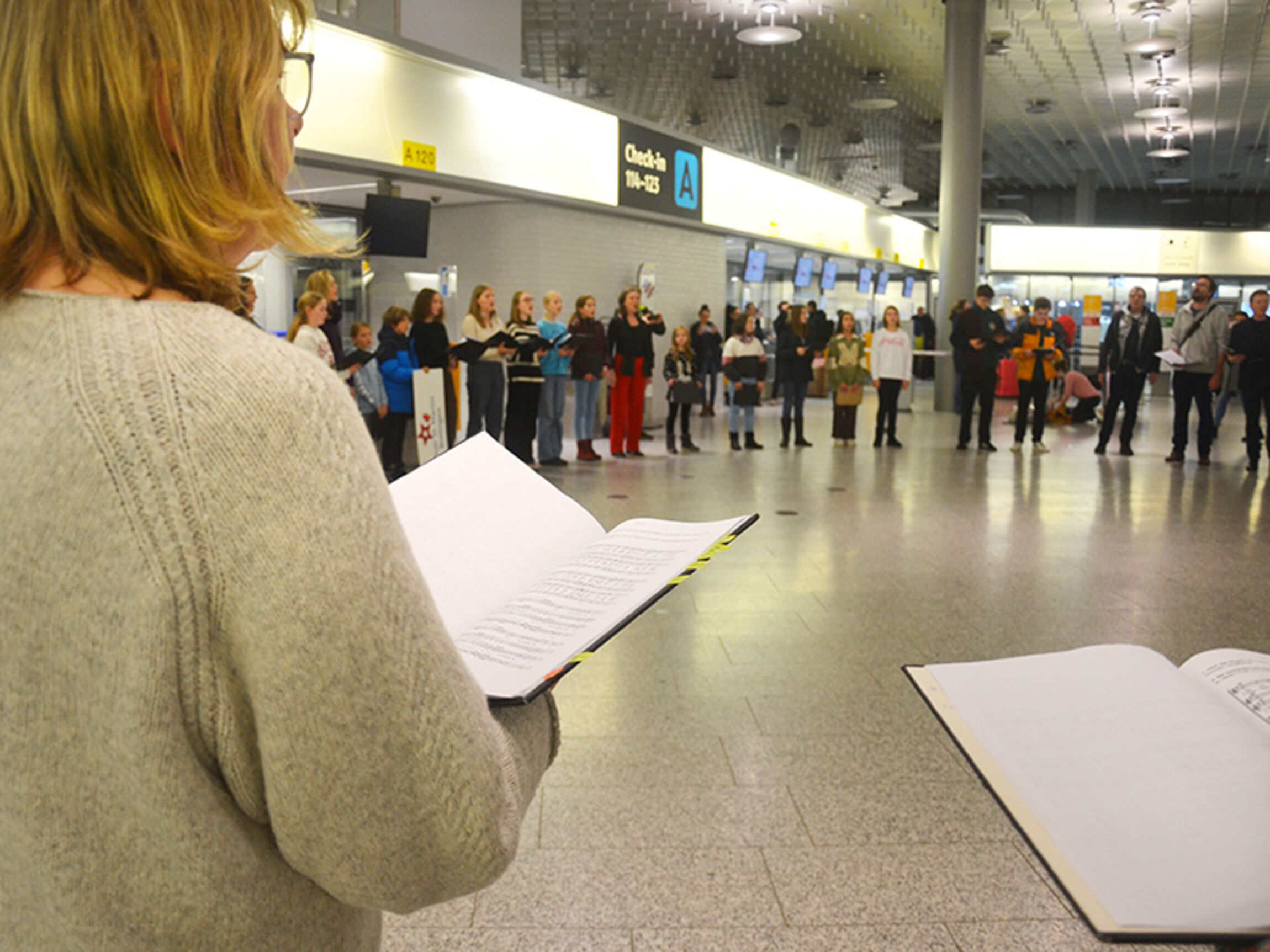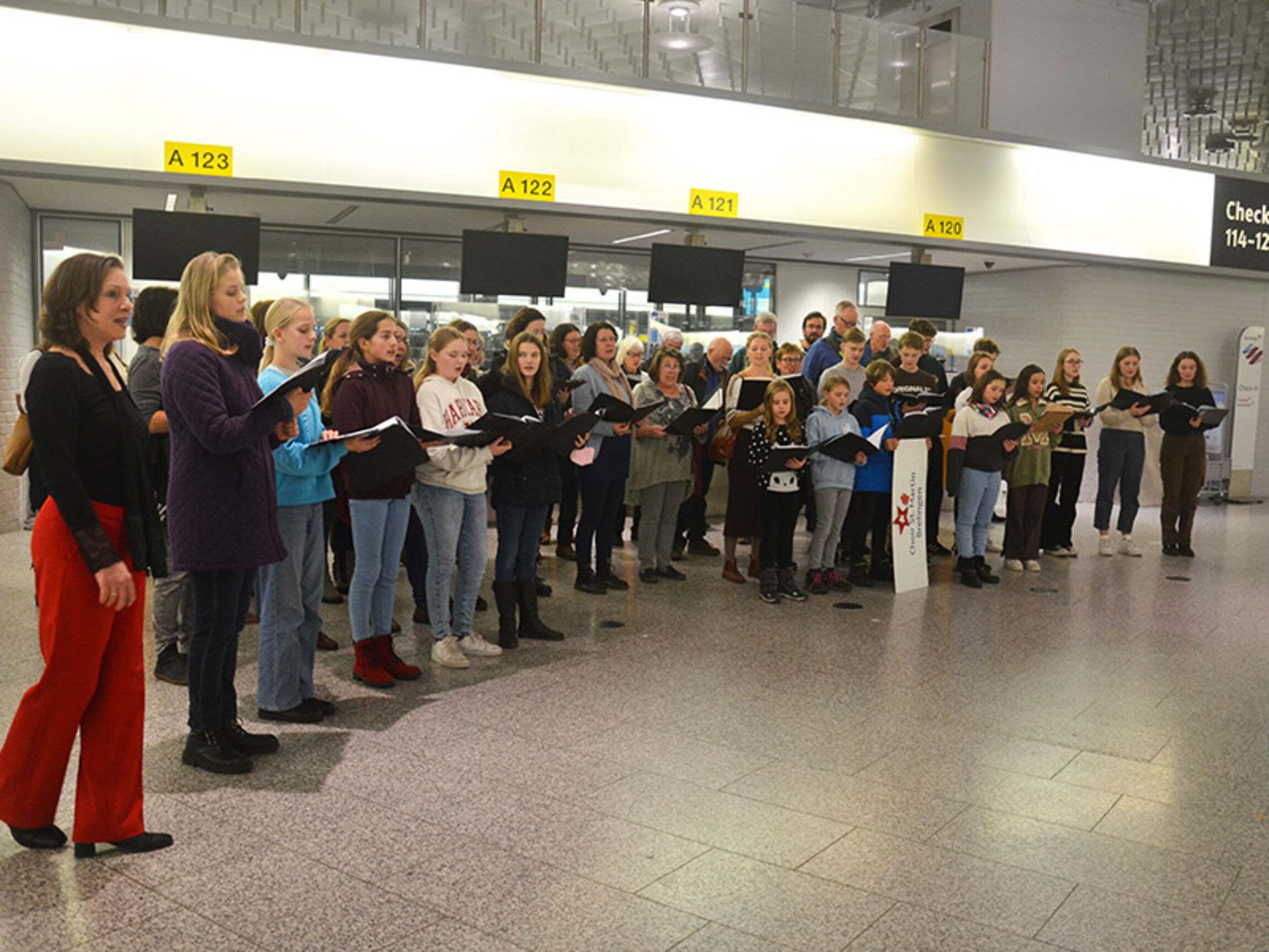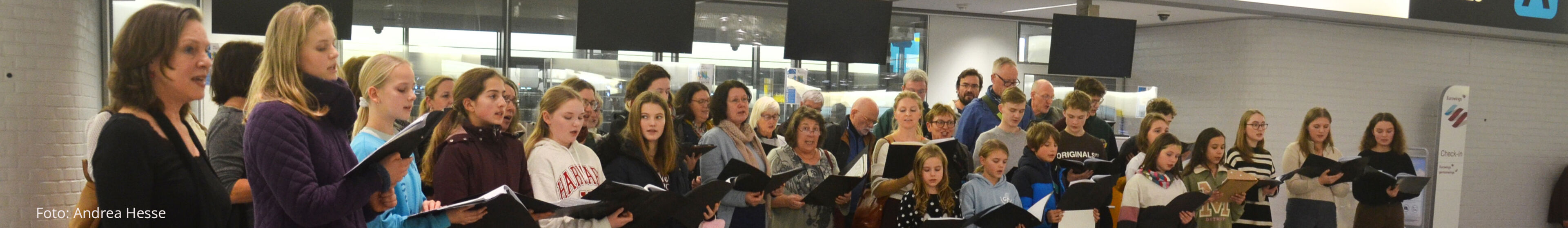 Schon vor Wochen ging Pastor Harms also auf die Chöre der evangelischen Kirchengemeinde St. Martini Brelingen unter der Leitung von Sabine Kleinau-Michaelis zu und konnte sie sehr schnell für eine Aktion in der Abflughalle des Flughafens gewinnen. Auch bei Flughafengeschäftsführer Prof. Dr. Martin Roll stieß Harms auf offene Ohren, und so fanden sich Reisende zwei Tage vor Weihnachten in einem Flashmob wieder. Sie eilten, begleitet von „Tochter Zion“, zu ihrem Check-In-Schalter oder blieben überrascht stehen, um einzustimmen. „Ich finde es toll, dass wir hier andere Menschen überraschen können“, sagte dazu die zwölfjährige Mila aus Brelingen, die schon seit Jahren im Brelinger Chor singt. Auch Mitarbeitende des Sicherheitspersonals und von den Abfertigungsschaltern sangen mit; offensichtlich vertraut mit Melodien und Texten stimmte auch Prof. Roll mit ein.