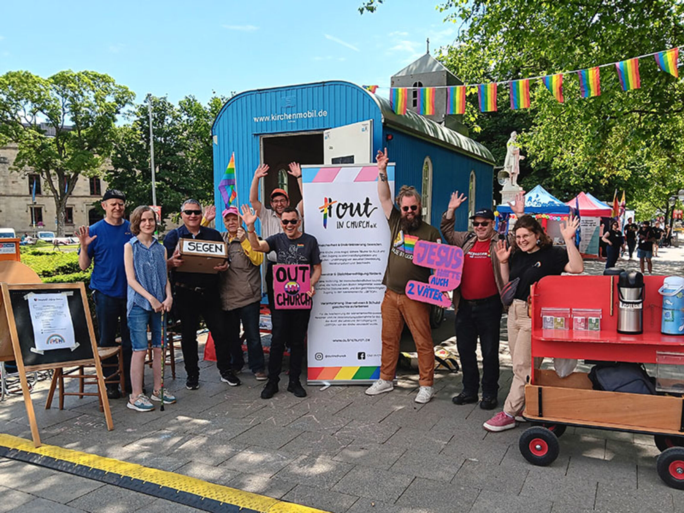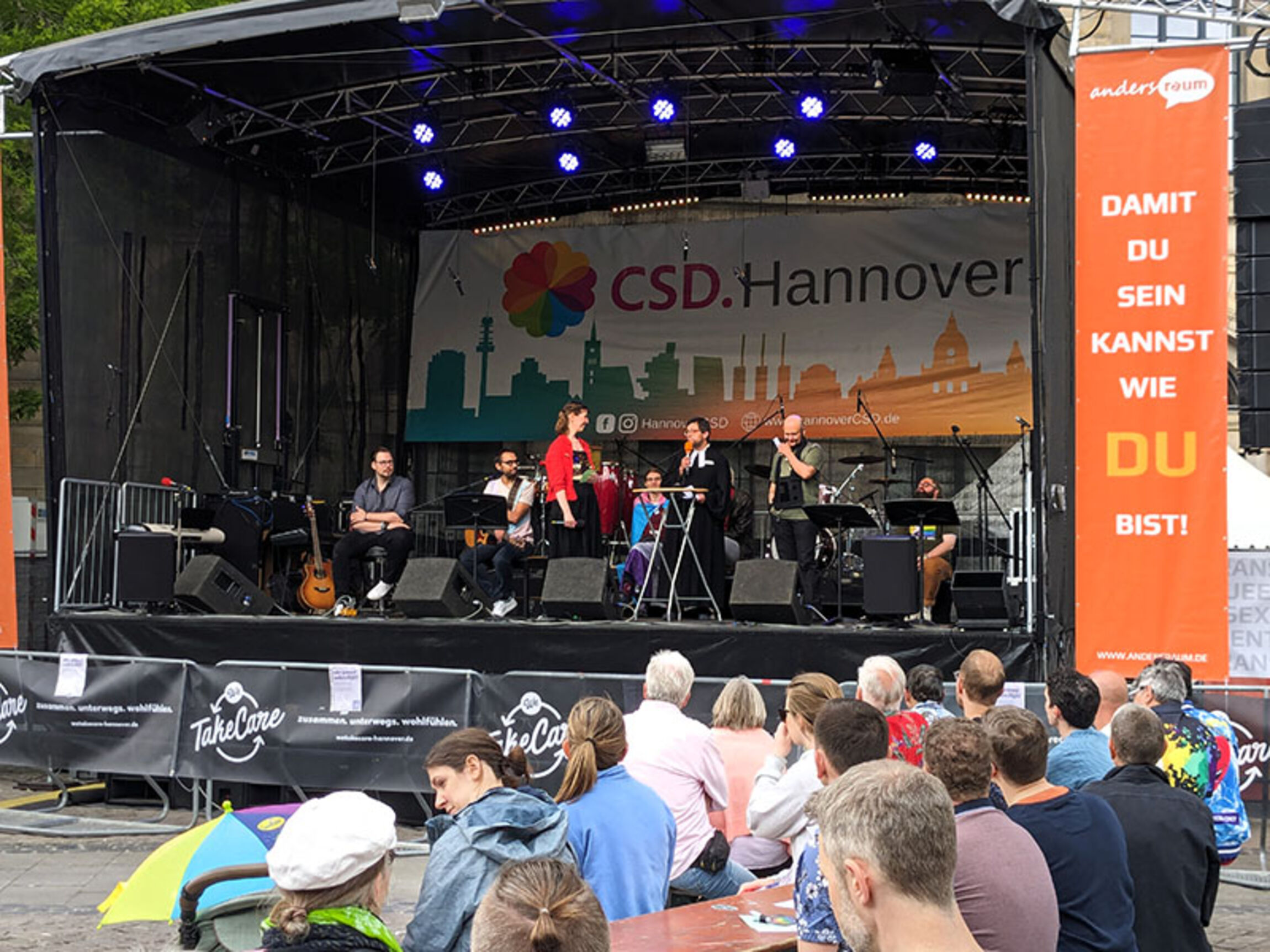 Unter dem Motto „Auf dich kommt‘s an! Gemeinsam für Demokratie und Menschenrechte“ feierten am Pfingstwochenende tausende Menschen den Christopher Street Day (CSD) in Hannover. 16.000 seien dabei gewesen, teilten die Veranstalter*innen im Anschluss mit. Auch die Kirche war mit einer rollenden Bauwagenkapelle und verschiedenen Ständen, beim Umzug durch die Stadt und auf der Bühne auf dem Opernplatz dabei.