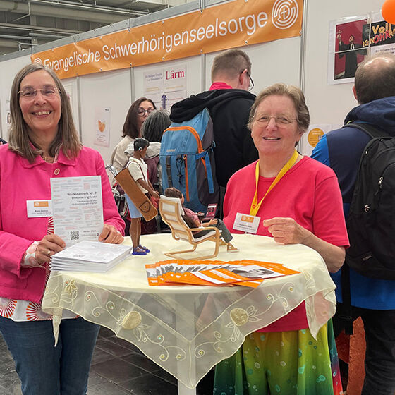 Beate Gärtner, Beauftragte für die Schwerhörigenseelsorge und selbst stark schwerhörig, machte ebenfalls nur gute Erfahrungen mit einem offenen, interessierten und sehr zugewandten Publikum. Eine Hörschleife, rund um den Stand der Evangelischen Schwerhörigenseelsorge auf den Hallenboden geklebt, machte es möglich, dass sie mit ihren Hörgeräten und dem um den Hals getragenen Empfänger gut mit den Besucher*innen ins Gespräch kam. Ihre Ermunterungstexte für schwerhörige Menschen, die sie in einem Werkstattheft des Zentrums für Seelsorge und Beratung veröffentlicht hatte, stießen dabei auf große Resonanz. Rosemarie Muth, Schwerhörigenseelsorgerin aus der Landeskirche Württembergs, steuerte viele technische Details bei und überraschte mit der Erklärung, dass die aufgeklebte Hörschleife aus einem schlichten Klebeband mit Kupferbeschichtung bestand. Erhältlich ist so etwas in Gartenmärkten; üblicherweise dient es dazu, Schnecken vom Entern von Blumenkübeln abzuhalten.