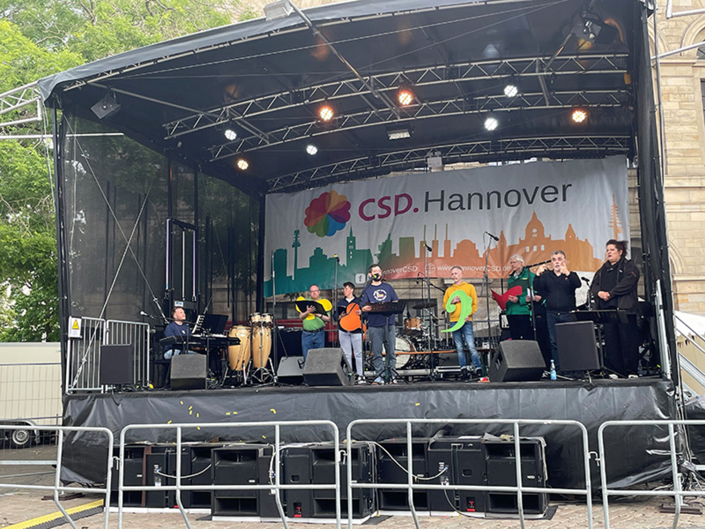 „Wir haben das Motto ‚Nie wieder still – nie wieder unsichtbar‘ des CSD 2025 mit vereinten Kräften wahr gemacht“, sagt Pastor Theo Adam vom Zentrum für Seelsorge und Beratung. Gemeinsam mit einem Team, zu dem auch Sonja Thomaier als ehrenamtlich mitarbeitende Pfarrperson und der katholische Priester Daniel Konnemann gehörten, feierte der Beauftragte für Queersensible Seelsorge und Beratung auf der Hauptbühne des CSD (Christopher Street Day) auf dem Opernplatz in Hannover einen Gottesdienst, in dem die Gemeinschaft und die Liebe Gottes zu allen Menschen aus seelsorglicher und politischer Perspektive im Mittelpunkt standen. Stimmgewaltig sang dazu der Schwule Männerchor Hannover; Stadtsuperintendent Rainer Müller-Brandes sprach eine Grußbotschaft. Im Anschluss an den Gottesdienst spendete Konnemann allen, die dies wollten, einen persönlichen Segen.