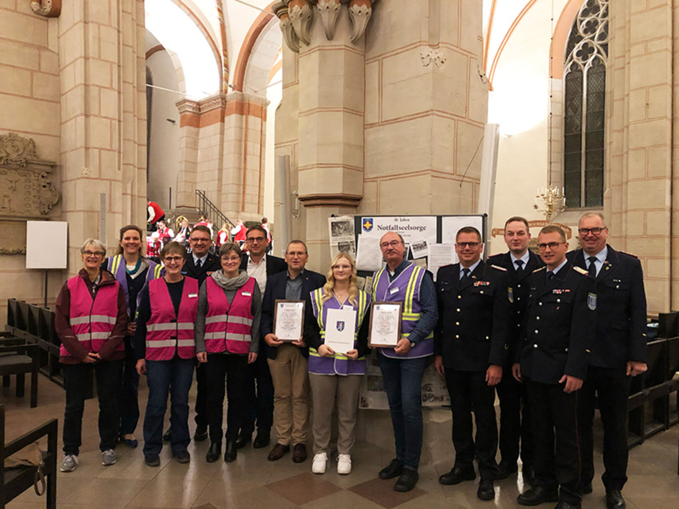 Seit 30 Jahren gibt es die Notfallseelsorge im Kirchenkreis und Landkreis Hameln-Pyrmont – das feierten die örtlichen Feuerwehren, der Rettungsdienst des DRK, Polizei, DLRG und das THW Hameln jetzt gemeinsam mit örtlichen Notfallseelsorger*innen im Münster St. Bonifatius in Hameln. 1995 war das System der Psychosozialen Notfallversorgung im Landkreis Hameln-Pyrmont von Berufsschulpastor und Feuerwehrmann Frank Waterstraat ins Leben gerufen worden; er gilt damit als einer der Väter der Notfallseelsorge in Deutschland.